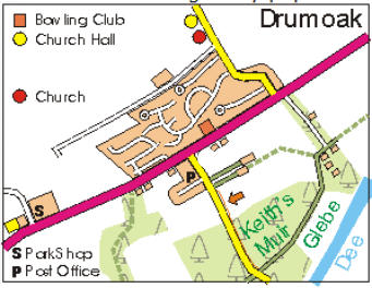 Drumoak has evolved from the holy well and church of St Malik by the river ford at Dalmaik, gradually shifting its community up to Drum and then towards the centre of the parish at the present village. Drumoak has a Post Office (tel no. 01330 811 201), a shop (a short walk to the West of Drumoak at Park - tel no. 01330 811 463), a church, a church hall (Drumoak Church Hall) and a new primary school (Drumoak Primary). Dee Valley Caravans operates from the former Park station yard. Drumoak also has the bowling green and clubhouse of the Drumoak Durris Crathes Bowling Club. The settlement of Drumoak itself is home to the largest concentration of houses between Culter and Banchory. The Drumoak area is bounded by the outskirts of Peterculter to the east, Crathes to the west and the Gormack Burn to the north. The River Dee itself forms its southern boundary. Eastwards from Drumoak, near the former Drum station, there are Drumoak Kitchens, the Mains of Drum Garden Centre, the SSPCA and the Heather Centre.  To the West is Anderson’s Smithy. North of Drumoak (although best accessed via the turning off the North Deeside Road (A93) at Mains of Drum) lie the grounds and delightful walled rose garden of the 12th Century Drum Castle.