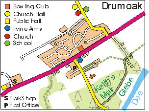 Drumoak is the largest by population of the three main settlements. The ma p shows the settlement of Drumoak, which has a Post Office (tel no. 01330 811 201), a pub (The Irvine Arms - tel no. 01330 811 423), a shop (a short walk to the West of Drumoak at Park - tel no. 01330 811 463), a church, a church hall (Drumoak Church Hall - bookings via Andy Coutts - tel no. 01330 811418) and a primary school: Drumoak Primary : Head Teacher Paul H Wilson : School Board, contact David Gray 01330 811697.